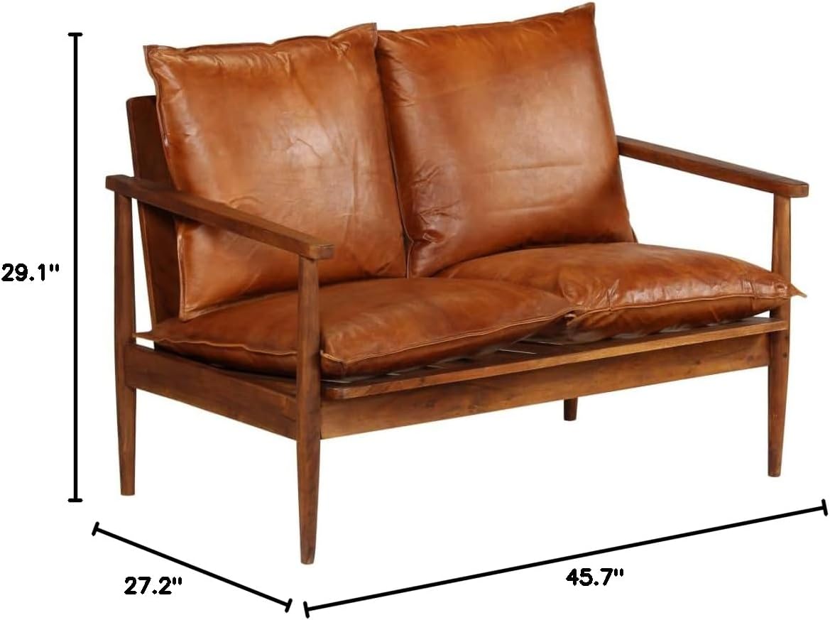 - Color: Brown / Dimensions: 45.7″ x 27.2″ x 29.1″ (W x D x H) / Frame material: Acacia wood with a honey finish / Upholstery material: Real leather