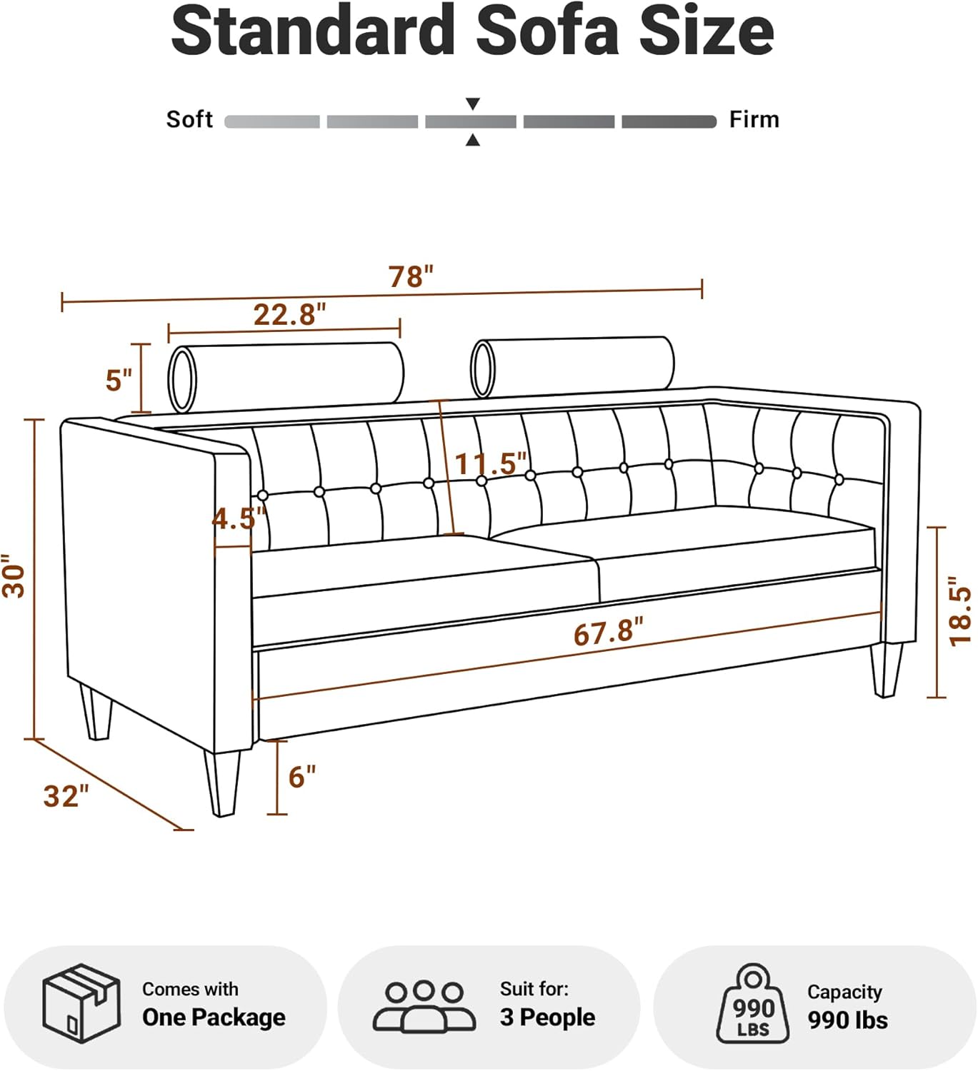 - DIMENSIONS:78″W x 32″D x 30″H | Seat Area: 67.8″W x 23.3″D x 18.5″H (from the floor). Featuring roomy depth, matching perfectly for Living Room, Bedroom, Apartment. 10-minute easy assembly install | Weight: 98 lbs.
